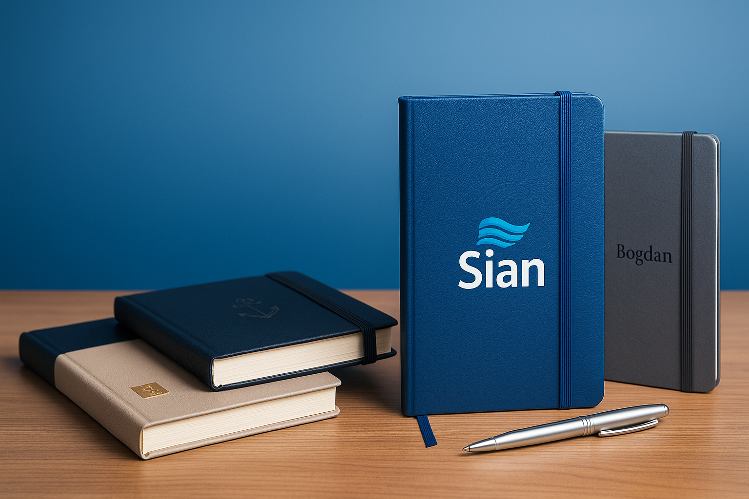 Pe lângă cele 3 categorii principale, Sian produce o gamă extinsă de agende personalizate pentru companii și cadouri. Lucrăm cu coperți din piele eco/naturală sau textile și personalizăm prin embosare, gravură laser, print UV sau folie (auriu/argintiu).